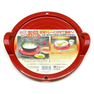 The plastic serving tray is durable and handy for kitchen and dining usage. It can be use to serve food in hot containers not exceeding 140ºC directly from the microwave oven onto the dining table. It can be use in microwave oven, but not in a conventional oven. Do not heat up oily food in container on the serving tray in the microwave oven as it might damage due to overheating. It cannot be use for heating earthenware pots or metal pots with legs as it might damage due to overheating. Diameter 22Cm.