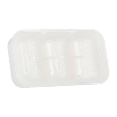 The sushi mould is made of high quality food grade plastic that can withstand up to 100C. Easy steps to use: 1)Add and top-up rice and ingredients into the mould. 2)Compact the content by pressing the cover over the mould. 3)Overturn the mould and cast out the content by pressing on the flaps underneath the mould. 10.4x5.7x3.4cm.