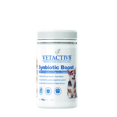 Taking probiotics and prebiotics promotes a healthy balance of gut and intestine bacteria. Studies show that the balance of bacteria in the digestive system is linked to a wide range of health benefits and the reduction of disease. VetActiv8 Synbiotic Boost was designed specifically for the canine digestive and immune system. It is highly palatable and can easily be sprinkled on your dogs food. The formula contains carefully selected and scientifically tested ingredients: Multiple-strain probiotics with a 50 billion CFU count Prebiotics specifically chosen to stimulate growth and activity of the formulas probiotics Colostrum, which is clinically proven to benefit the gut and immunity function with daily intake.