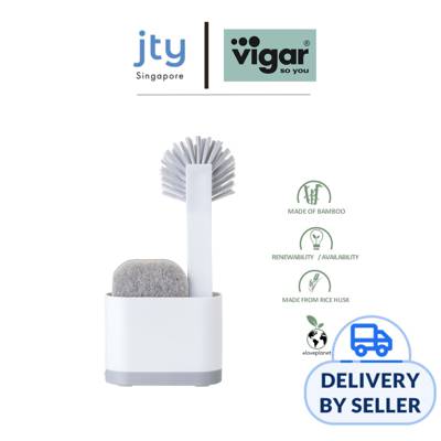 Includes: 1 x Dish Brush + 1 x Sink Caddy + 1 x Double use Sponge Inside you can adapt three categories of different Vigar dishwasher brushware. It incorporates some holes in its base for easy drainage to the removable tray from the bottom. The thin design allows to located between sink and kitchen wall without compromising the space.
